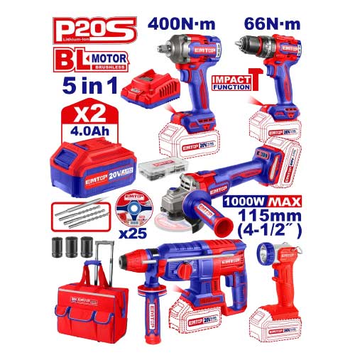 הסט כולל: מברגת אימפקט 20V + מבריגת פוטר 20V + משחזת זווית "4.5 1000W + פטישון נטען 20V + פנס נטען 20V + מטען + 2 סוללה 4Ah + עגלת תיק + סט מקדחים ומובילי ביט + 25 דיסק חיתוך ברזל "4.5
